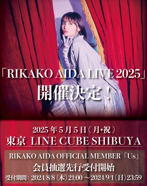 アーティストデビュー5周年を記念したライブは、5周年らしく日付に“5”が並ぶなど、どのようなライブ内容になるのかも注目。チケットは、メンバーサイト『RIKAKO AIDA OFFICIAL MEMBER「Us」』で会員先行を実施中だ。