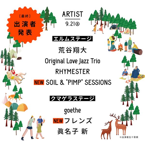 今回新たに、初日にSOIL & “PIMP” SESSIONS、フレンズ、2日目にBENBEの出演が決定。2日間合計14組の出演者が出揃った。チケットは現在一般発売中。
