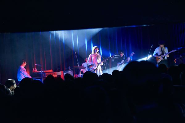 中塩のボーカルによる耽美的な「子宮」から、平川がフォーキーで軽やかなギターを奏でて歌う「Kajiura」へと続き、ゆったりとした鍵盤の音色でスタートしたのは「星の口紅」。ボーカルをとるのは黒羽だ。ふたりとはまた違うエモーショナルな歌声が変化球となり、また一瞬、誰の歌声?という感じで観客がメンバーそれぞれに視線を走らせるような仕掛けもある。全体を通して暗めの照明が基調なことも相まって、ワクワク感が増す。そして不穏なベースから新曲「君のせい」へと続く。