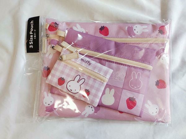 3連ポーチのサイズは大中小で、それぞれ異なるミッフィーのイラストが描かれています。
