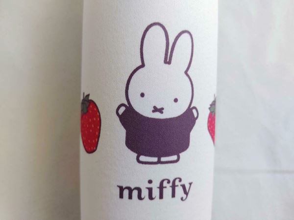 中央には両手をあげたミッフィーと、イチゴのイラストが描かれています。見ているだけで癒されるようなほっこりしたデザインです♪