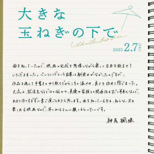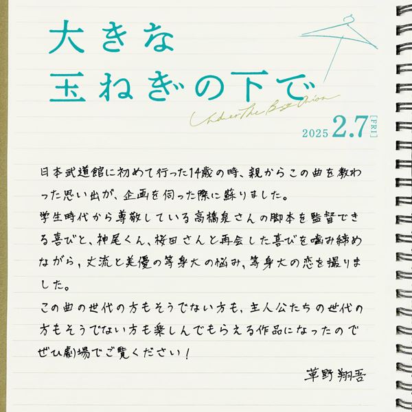 恋愛小説の名手・中村航氏と、脚本家・高橋泉氏のタッグで、幅広い世代に知られているラブソングをモチーフにした、恋愛小説と実写映画を同時進行する企画を立てました。モチーフとする楽曲は、偶然にも中村航氏とご縁のあったサンプラザ中野くん率いる爆風スランプに快諾いただき、名曲「大きな玉ねぎの下で」に決定しました。リアルタイムなコミュニケーションが当たり前になっている今だからからこそ現代人の心に響く、エモーショナルで美しい令和の恋愛映画になっております。この名曲が、どのようにスクリーンに映し出されるのか、是非映画・小説ともにお楽しみにしてください!