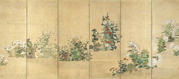 たとえば根津美術館が誇る鈴木其一の《夏秋渓流図屛風》はその代表的な例で、右隻には白い山百合の咲く夏、左隻には桜の葉が赤く色づく秋を描いている。実はこの夏・秋の取り合わせは、琳派の祖・俵屋宗達が主宰した工房のトレードマーク「伊年」印が捺された《夏秋草図屛風》に遡る。17世紀、俵屋宗達の2世代後の後継者・喜多川相説周辺で制作されたとみられる本作は、墨を多用して表現された夏から秋にかけての草花が、穏やかな韻律を刻む作品だ。