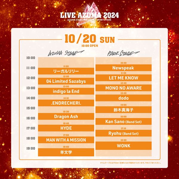 すべて見る10月19日(土)・20日(日) に福島・あづま総合運動公園と福島あづま球場で開催される『LIVE AZUMA 2024』のタイムテーブルが決定した。