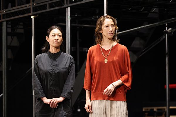 二場は、副筋となるリア王の家臣・グロスター伯爵(演:伊原剛志)一家のシーン。グロスター伯爵の私生児であり、後継ぎの座を狙うエドマンド(演:章平)の独白から。エドマンドは、父とのやりとりを経て、グロスター伯爵の嫡子でありエドマンドの策略により追いやられるエドガー(演:土井ケイト)とも会話を交わす。目まぐるしい展開で、一言も聞きもらせないセリフの応酬が続くが、それぞれ俳優の集中力が素晴らしく、観客の視線を吸い寄せる。ウィットに富んだ章平の芝居も、勢いと憂いが共存する伊原の芝居も見どころだが、今作ではエドガーを女性が演じるところが特徴的。そのキャスティングの理由を藤田はインタビューで「グロスター伯爵には私生児のエドマンドという子どももいますが、グロスターの言動から、彼の物事の捉え方なら、嫡子(=エドガー)であれば女性でも家を継がせてもおかしくない、と考えました」と説明している。藤田の演出作品に何度も出演している土井ケイトならば、しっかりとその役割を理解し、期待にも応えてくれるだろう。