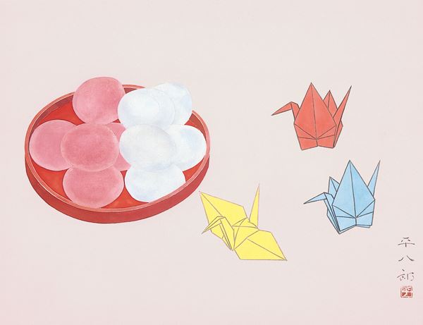 福田平八郎《紅白餅三鶴》1960(昭和35)年頃 個人蔵