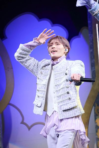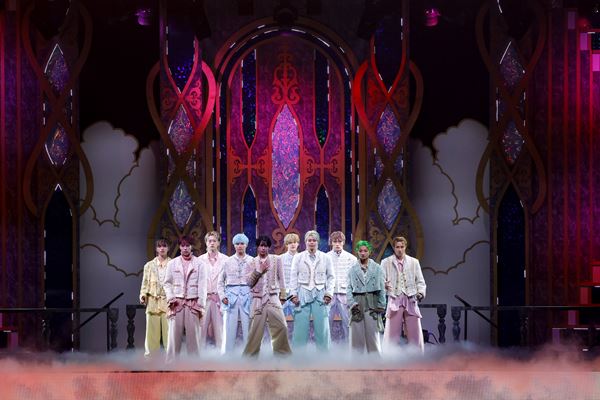 それぞれの愛をたっぷりと伝えたところで、ここからはラストスパートだ。「BUD」では、タオルを手に、ステージギリギリ端まで行く。サビではメンバーはタオルを、バディはペンライトを元気よく回す。ボルテージが上がっていくなか、ステージ中央には階段が。そこをゆっくりと10人が上っていく。再び、ユートピアのお城の中へ。そこで披露するのは「JUBiiLEE」。どこかファンタジックさを感じさせるメロディに、ステージセットがマッチして、まるでテーマパークにやってきたようで、ハッピーな気持ちが盛り上がっていく。