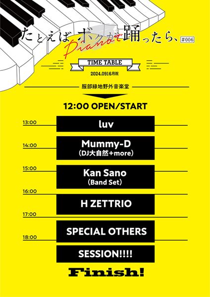 今年は、「ピアノ」をテーマに行われ、H ZETTRIO、SPECIAL OTHERS、Kan Sano(Band Set)、Mummy-D、luvが出演する。今回は、タイムテーブルが発表された。
