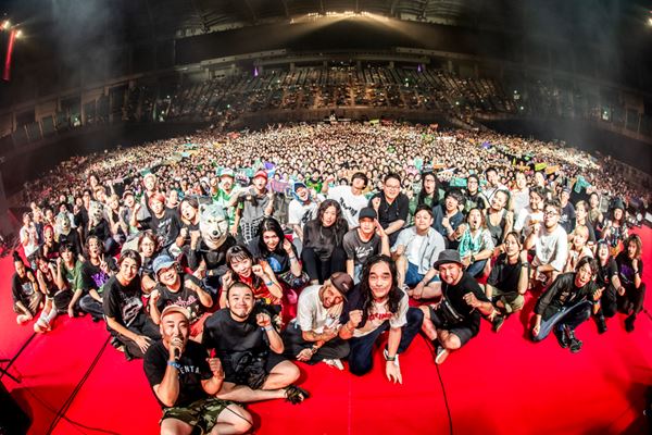 フロアに袋詰めの「うまい棒」が配られ、観客ひとりひとりがうまい棒を掲げると、「赤城STAGE」初日のトップを飾ったのは打首獄門同好会だ。切れ味抜群の重低音が轟くと、まずは『デリシャスティック』でスタート。次の『筋肉マイフレンド』に入ると、スクリーンに筋肉の名前が映し出され、後半は観客総出でスクワット大会へと突入。何だ、この景色は!楽しすぎるではないか。「本日から3連休であるぞー! 険しかった平日の日々を、今日の楽しみの糧にする!」と大澤敦史(vo/g)がMCを入れた後、『はたらきたくない』に進むと、ノリのいい曲調に観客は大騒ぎ。それから後半は必殺の”食べ物シリーズ”が続く。メタル仕込みのラウドな演奏にシビれる『きのこたけのこ戦争』を皮切りに、マグロのバルーンが観客の頭上を泳ぐ『島国DNA』、そしてラストは『日本の米は世界一』と畳み掛け、お昼前という時間帯に身も心も胃袋も抉るサウンドを叩きつけてくれた。