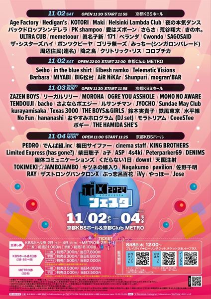 11月4日(月・休)には、フリースタイル日本統一にて優勝経験がある歩歩率いるザストロングパンタロンX、元NMB48の木下百花によるぶっ恋呂百花、浮遊感あるサウンドが少女感を煽るネット発宅録ユニットiVy、はまいしんたろうによる8bitハードコアパンクプロジェクトやっほー、叙情的な楽曲と気迫ある演奏で聞く者を圧倒させるJoseが出演。
