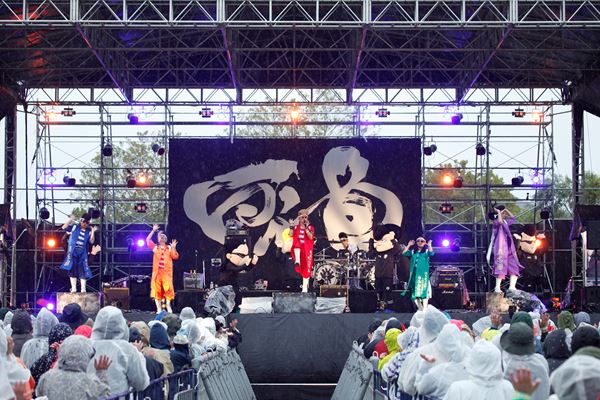 バイクの爆音とともに千葉県木更津から国道を北上してやって来たのは氣志團。「俺達には土曜日しかない」でオーディエンスの共感を呼び、「房総魂」で一気に駆け抜ける。氣志團が歌う“街”や“仲間”は、オーディエンス一人ひとりの心に浮かぶそれらだ。「ACMFずっと出たかったよ。優くんありがとう」と綾小路翔が感謝を伝える。『氣志團万博』を継続して開催している氣志團だからこその気持ちのこもった言葉だ。と次の瞬間、ステージには巨大なQRコードが入場。ライブ中も氣志團万博のチケット購入手続きが可能というお茶目すぎる仕掛けがなんとも氣志團らしい。後半は、「落陽」「One Night Carnival」でピリオドの向こうへオーディエンスをいざなった。