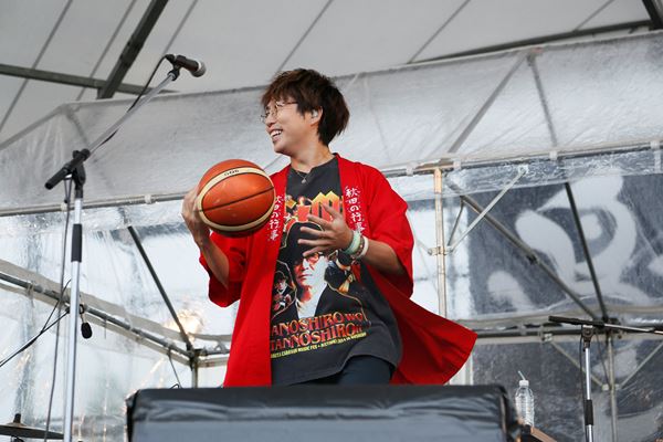 齋藤滋宣・能代市長の開会宣言が行われたオープニング・セレモニーでは、赤いハッピを着た高橋優がバスケットボールをドリブルしながら登場。そう、能代といえば圧倒的な強さで一時代を築いた能代工業高校(現:能代科学技術高等学校)のバスケットボール部が有名だ。そしてバンドとともに前回から恒例となっている、このフェスのテーマソング「秋田の行事」のパフォーマンスで今年のACMFが幕を開けた。