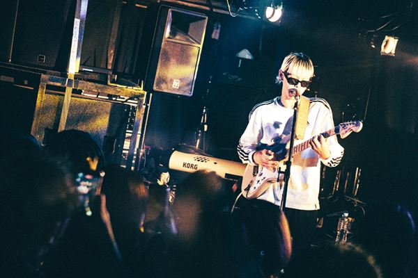 黒のサングラスを外した小腸は、Geloomyのライブを初めて観る人とすでに観たことがある人が入り混じった様子に満足げな表情を浮かべ、「シングルを出したので、ちょっとやらせていただきたいと思っている所存でございます」と“Black Cinema”へ。ずっしり重くスロウなビートにユーモアのある手振りで乗りこなす小腸、頭を前後に揺らしながらバンドサウンドに厚みを加えていく肝臓のキーボード、後方に位置取るベース・腎臓とドラム・肺が放つフロウが実に心地いい。