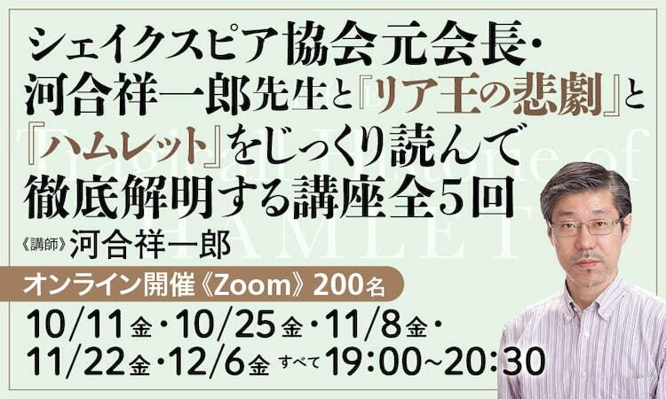 講座は全5回で、10月11日、25日、11月8日、22日、12月6日の19:00から20:30まで、Zoomにて。参加者は、「新訳 リア王の悲劇」「新訳 ハムレット 増補改訂版」(共に角川文庫)を手元に受講することが推奨される。受講のみの料金は税込1万9800円。詳細は公式サイトで確認しよう。