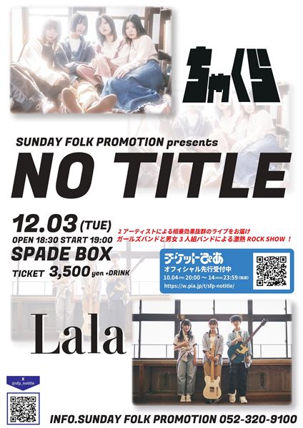 『NO TITLE』は、サンデーフォークプロモーションが贈る今注目のアーティストをツーマンで紹介するイベント。今回は、2022年6月に結成されたガールズバンド「ちゃくら」と、力強くも繊細なギターロックバンド「Lala」が出演する。
