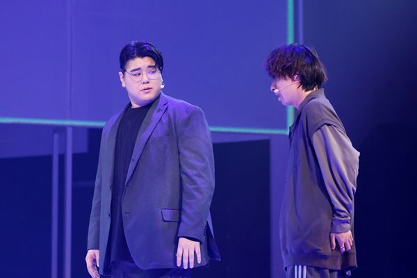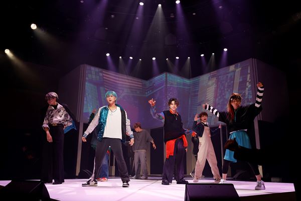幕が上がると、ショーを模したダンスパートからスタート。円形のステージと客席までをも使用した華麗なダンスパフォーマンスで一気に観客を物語の中へと誘っていく。しかし、その最中で殺人事件が発生。「ネスト」から依頼を受けたハウス「ホークアイズ」の名探偵・司波仁(持田悠生)と、記録者の枯柳杖道(小坂涼太郎)、物怪瑠衣(西山蓮都)が現場を訪れると、そこには舞台オリジナルハウスとなる「パロットビーク」の名探偵・天幻次彩(砂川脩弥)、記録者・清月舞蕾(井尻翼馬)、麗蘭百華(湊丈瑠)の姿が……。