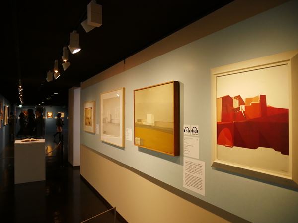 今回の展覧会では、展示品とともにル・コルビュジエが設計を手がけた会場にも注目したい。1階の19世紀ホールでは、高い吹き抜けの天井から柔らかな自然光が空間を満たし、建物を支える太い円柱やスロープ、三角形のトップライトなどの幾何学的な形が見事に調和している。そしてスロープを上った2階フロアは19世紀ホールを取り囲むように配置され、高低差のある天井や中3階へと続く階段、採光のための窓がリズミカルな空間を作り上げている。