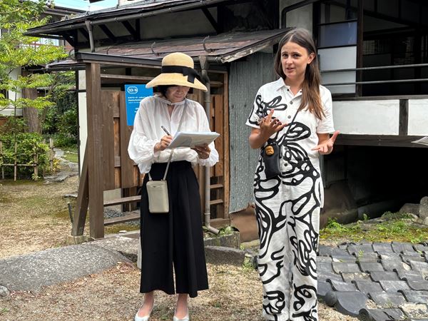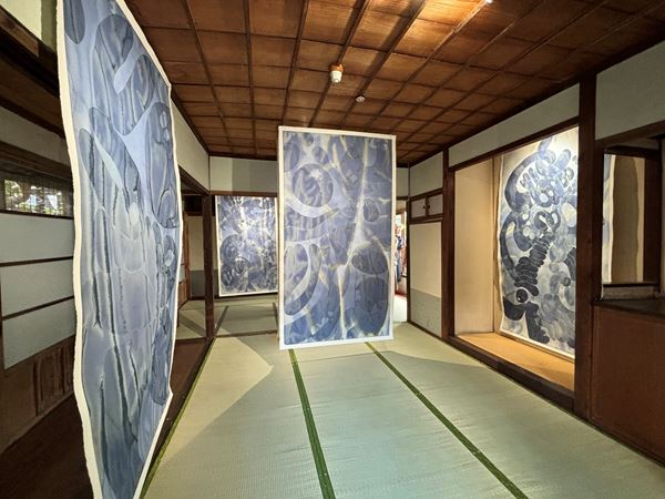 今は空き家となった風情ある町屋で作品を発表しているのは、ロシアにルーツをもつエカテリーナ・ムロムツェワ。家屋の下を流れる水の音にインスピレーションを得たというムロムツェワは、水の重なりを抽象的な水彩で表現。薄い紙に描かれた作品が、床下を流れる水音に呼応するかのようにゆらぐ様子が心地よい。ムロムツェワは、東山エリアの佐々屋幾神社でも日本の民話からインスピレーションを得た映像作品を発表している。