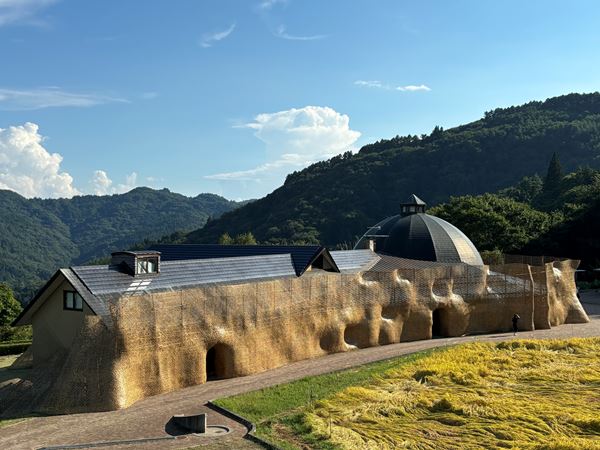 地域の人々が集う八坂公民館を、竹を編み込んだ造形でぐるりと一周囲うというダイナミックなインスタレーションを展開しているのは、台湾のアーティスト、ヨウ・ウェンフー〈游文富〉。竹が波をうっているようなデコボコとした囲いの形状は「風のかたち」を表しており、目には見えない「風」がそこに吹き抜けていることを可視化している。取材時は公民館の手前にある田んぼの稲が風で倒されており、その風景も含めて北アルプスを吹き抜ける風の存在を視覚的に感じさせていた。