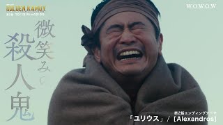第2話のエンディングテーマは、[Alexandros]の新曲「ユリウス」。同曲について川上洋平(vo&g)は、「ありとあらゆる鬱憤を晴らすようなロックソングがやっと完成しました」、磯部寛之(b&cho)は、「『ゴールデンカムイ』は、一見シンプルな目的の中に交錯していくさまざまな過去や思惑がスリリングでカッコ良くて魅了されます。そんな作品のエンディングを担えて光栄です」とコメントしている。
