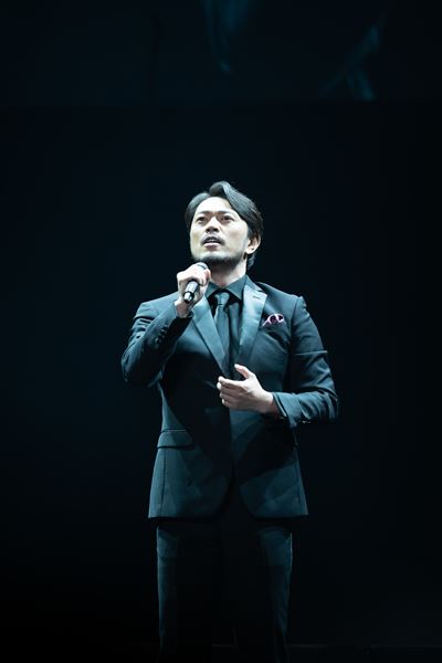 会見では最初に劇中歌5曲が披露された。まずは主人公ジャン・バルジャンに初キャスティングされた飯田洋輔による『独白』。劇団四季出身で、四季時代は『美女と野獣』『オペラ座の怪人』など大作ミュージカルの主役を数々務めた実力者が、さすがの美声と豊かな声量で難曲を響かせる。