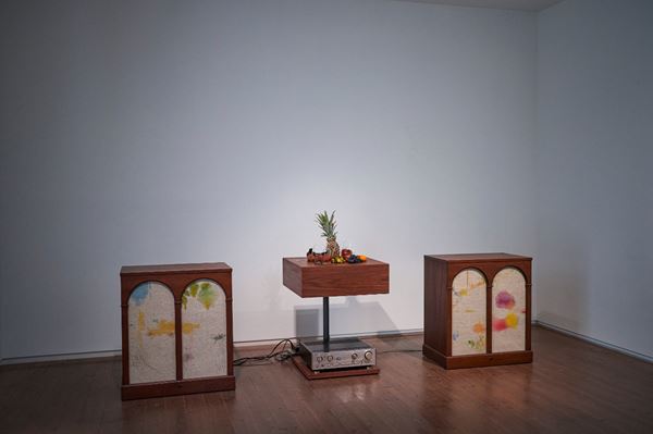今年「第60回ヴェネチア・ビエンナーレ国際美術展日本館」で開催中の個展では、ヴェネツィアで入手した日用品などを組み合わせて水が循環するインスタレーションを制作。また、フルーツに電極を刺して水分量の変化を電気変換し、ドローン(持続音)が発生し光が明滅。フルーツは朽ちてコンポストを通じて肥料へと変化する循環型の作品も発表した。これらは音楽的で色彩も美しい軽やかな作風でありつつ、気候変動などの問題にも応答している。