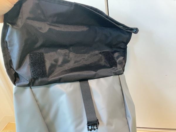 さらに、ロールトップデザインで面ファスナーとバックルでしっかりと巻いて閉じることができるので、上からの雨もしっかりガード! ただし完全防水ではないため、大雨や長時間の水濡れにさらされる状況では注意が必要です。