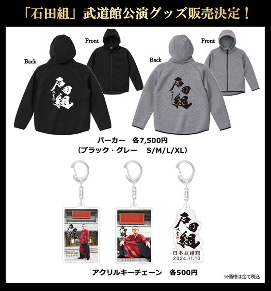 当日は、これまでの10周年記念ツアーグッズに加え、「石田組」のロゴが背面にデザインされたパーカーと、アクリルキーチェーンの2アイテムが販売される。チケットは通常席が完売となっており、現在見切れ席が追加販売中だ。