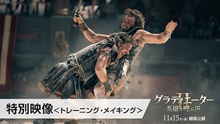 今回公開されたのは、メスカルを中心にコロセウムの最強グラディエーターバトルをいかにして作り上げたか、その裏側に迫る特別映像。「ここにいる意味を考えろ! この努力が作品を創り上げる!」と力強い叱咤激励をとばすトレーナーとともに、大勢の屈強な漢たちがトレーニングに励む光景や、まるで当時の剣闘士さながらにセットの中で訓練に取り組む姿などが映し出されていく。「ワイヤーはいらない」と体当たりのアクションシーンに挑むメスカルの熱い役者魂が垣間見え、スコット監督も「ポールの動きは俊敏で剣使いは秀逸だった」と大絶賛している。