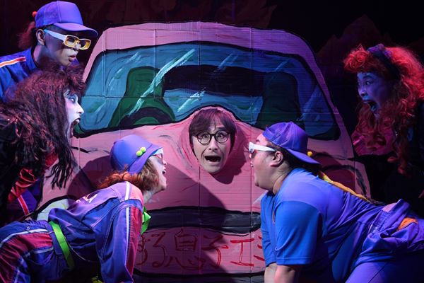 「ちょっぴり観客参加型」と説明があるように、客席にはミニライトとミニラッパが置かれている。まずはストーリーテラーを務める曽世が雰囲気たっぷりな佇まいで登場。不気味ながらコミカルに世界観を説明し、観客に配られた白い紙で紙吹雪を作る練習が始まる。それによって劇場内に一体感が漂い、さらに小飯塚貴世江と柳内佑介によるポップでクセの強いテーマ曲によってあっという間に『キッチュ&ホラー・イン・モータース』の世界に引き込まれた。レトロでポップな可愛らしさとアングラ感が両立している衣装・ビジュアルや舞台美術も見応えがあり、このカンパニーが作る物語に夢中になってしまう。
