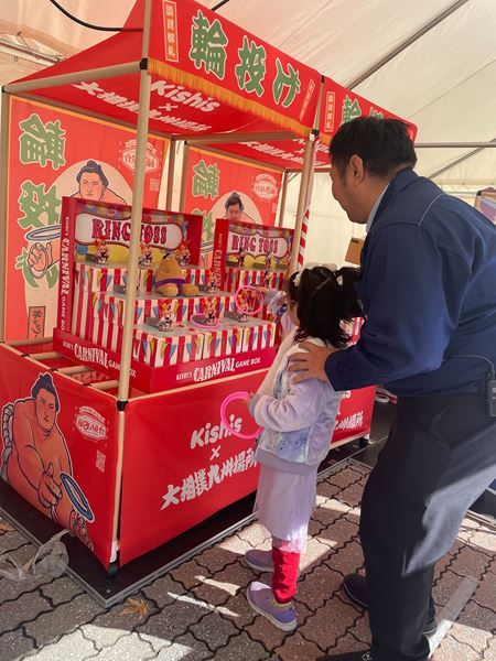 お客様の中にはファミリー層も多い。大相撲は朝から夕方まで1日かけて取組が行われる。子供たちが退屈せずに楽しめるエリアを作ろう!ということでお祭りブースのような『相撲縁日』がスタート。子どもから大人まで笑い声が響き渡るエリアとしてお馴染みのものとなっている。大相撲グッズもゲットできるチャンス!!
