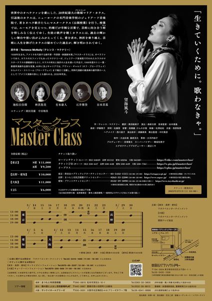 『マスタークラス』は、2025年3月14日(金) から23日(日) に東京・世田谷パブリックシアターで上演後、3月29日(土)・30日(日) に長野・まつもと市民芸術館 主ホール、4月5日(土)・6日(日) に愛知・穂の国とよはし芸術劇場 PLAT、4月12日(土) から20日(日) に大阪・サンケイホールブリーゼで上演される。
