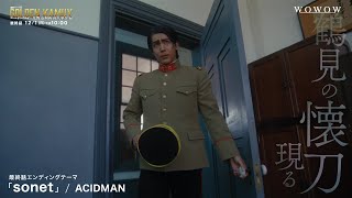 最終話のエンディングテーマは、ACIDMANの新曲「sonet」。この楽曲のテーマは、小さな出来事が最終的に予想もしていなかったような大きな出来事につながることを意味する言葉“バタフライエフェクト”。新たなアプローチで『ゴールデンカムイ』の世界を表現したという意欲作だ。エンディングテーマについて彼らは「あの日の君の涙はいつか雨になり、きっとどこかの花を咲かす。杉元とアシリパさんたちの旅に小さな花を添えることができますように」とコメントを寄せた。