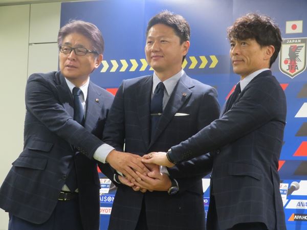 (写真左より)山本昌邦ナショナルチームダイレクター、大岩剛監督、宮本恒靖会長