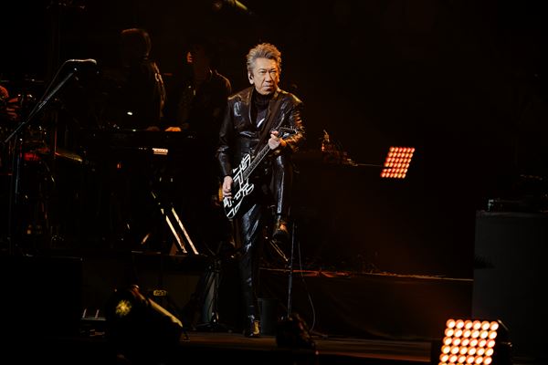大歓声に包まれながらバンドメンバーが登場。それぞれの持ち場につくと、1日目とは打って変わり、ブラックレザーのスーツでシックにキメた布袋がステージのセンターに立った。