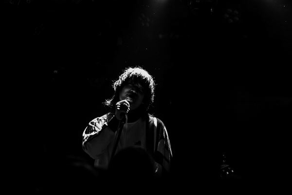 そんなMCのふざけた感じと、いざ曲が始まったときのピンと張り詰めた緊張感、その落差、お笑い的に言うなら緩和と緊張のコントラストがPK shampooである。ダークな照明の中「S区宗教音楽公論」がずっしりとした質感とともに披露されると、そのままギターのサウンドでつなぐようにして「m7」。フォーキーなメロディにのせたヤマトの言葉にならない叫びが会場の空気をさらに熱くさせる。どこまでも高まっていくようなその歌に圧倒される。