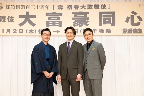 「壽 初春大歌舞伎」新作歌舞伎『大富豪同心』取材会より、左から)尾上菊之丞、中村隼人、松本幸四郎