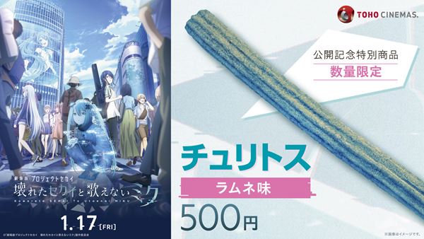 『劇場版プロジェクトセカイ 壊れたセカイと歌えないミク』公開記念特別商品『チュリトス ラムネ味』発売 映画 ニュース ぴあ 25/1/9(木) 19:00 『チュリトス ラムネ味』イメージ 続きを読む このままWebで読む 続きをアプリで読む フォトギャラリー(2件) すべて見る 『劇場版プロジェクトセカイ 壊れたセカイと歌えないミク』の公開を記念して、特別商品『チュリトス ラムネ味』が全国のTOHOシネマズ上映劇場にて1月10日(金) より数量限定で発売される。 本商品は、人気商品チュリトスに劇中に登場する「閉ざされた窓のセカイの初音ミク」のイメージカラーをモチーフにしたラムネシュガーをまぶした商品となる。 <商品情報> チュリトス ラムネ味 1月10日(金) より数量限定販売 価格:500円(税込) 販売劇場:全国のTOHOシネマズ上映劇場 次のページ フォトギャラリー(2件) すべて見る 次のページ