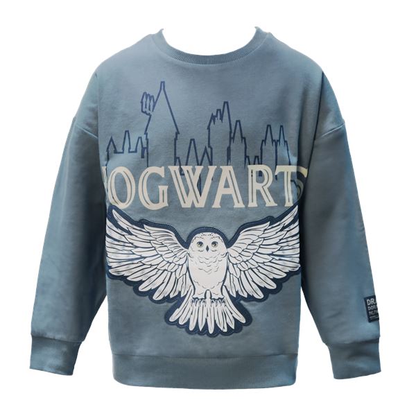 翼を広げたヘドウィグとクラシックな「ホグワーツ」の文字のワッペンが施された子ども用スウェット。100%コットンの柔らかなフィット感が優しく包み込みます。