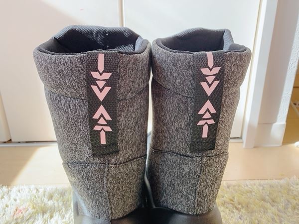 また、このブーツを後ろから見ると、模様のようなデザインの反射材が付いています。暗いところの視認性を高めてくれるので、夜間や早朝の外出も安心です♪