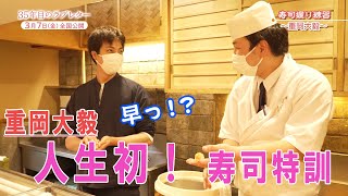 冒頭では、職人からアドバイスを受け、落ち着いて寿司を握る鶴瓶の姿が映し出される一方で、目の前で見る職人技に驚きを隠せない重岡の様子も。重岡は寿司を握る難しさを実感しつつ、懸命に練習を繰り返したおかげで、指導にあたった職人も「手つきがしなやかで、(握りの)工程が上手」と絶賛するほどに上達した。