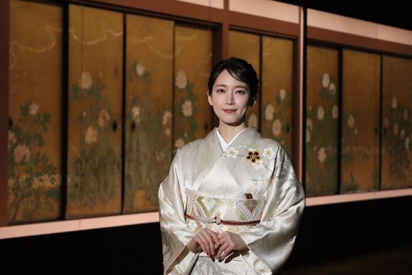 『旧嵯峨御所 大覚寺 -百花繚乱 御所ゆかりの絵画-』PR大使・音声ガイドナビゲーターを務める吉岡里帆。狩野山楽筆《牡丹図》の前で