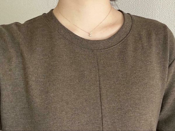 クルーネックの首元は開きすぎず詰まりすぎない絶妙な開き具合。鎖骨がほどよく見え、首元をきれいに見せてくれます。