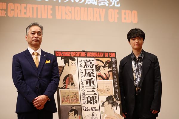 左から、『蔦屋重三郎 コンテンツビジネスの風雲児』担当の東京国立博物館学芸企画部長の松嶋雅人と、同展の広報アンバサダーに就任した俳優の染谷将太