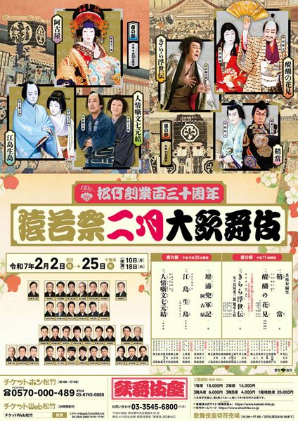 松竹創業百三十周年を記念する本年も、歌舞伎座2月公演は江戸歌舞伎の発祥を寿ぐ「猿若祭」を銘打ち公演する。古典の名作から華やかな舞踊、大河ドラマでも取り上げられている蔦屋重三郎を描いた話題作まで、多彩な演目が揃い、初春にふさわしい華やかな舞台が堪能できる。
