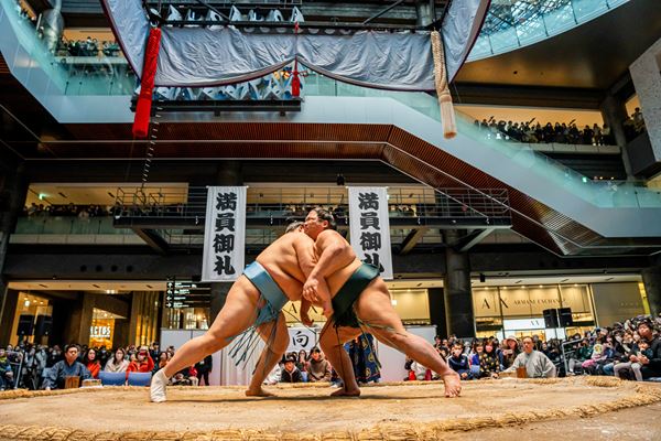 今年度も北館1Fナレッジプラザに国体や地方巡業でも使われる本格的な土俵が登場し、琴櫻関、平戸海関など人気力士たちの迫力ある取組や、禁じ手を面白おかしく披露する「初切(しょっきり)」、「弓取式」などを披露するほか、事前に募集した子どもたちと力士が取組を行う「ちびっこ相撲」も実施。また、海外からの旅行者をはじめ多様な来街者に日本の相撲文化の魅力を発信すべく、英語でプログラムを説明する「英語対応コーナー」が設けられる。