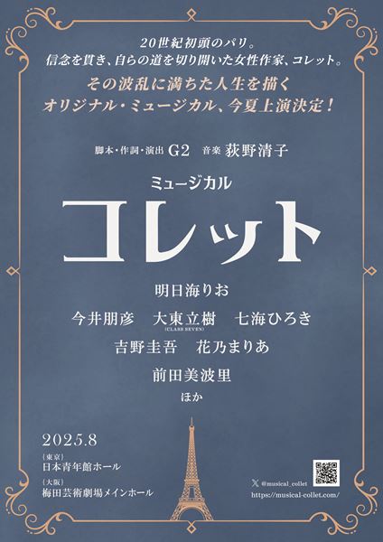 自らの才能を信じ、時代の常識や制約を超えて生き抜いたコレットの物語は、現代を生きる私たちにも大きな勇気を与えてくれるはずです。G2さんの演出のもと、心を込めて演じ、ドラマティックな舞台をお届けできるよう精一杯挑みます。時代を超えて響くこの物語を、皆様と一緒に受け止め、歩んでいけたらと思います。よろしくお願いします。