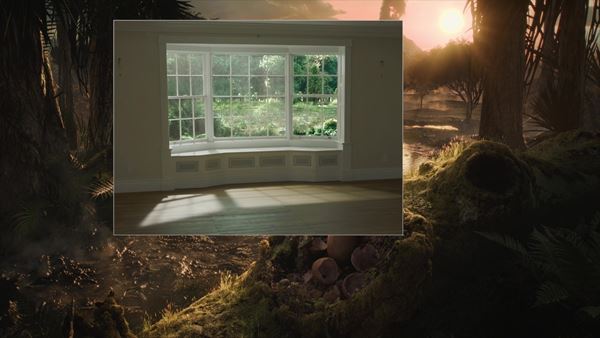 映像では、本作の舞台となる“家”が建てられる以前、紀元前で恐竜が駆け抜ける場面や、巨大な隕石によって氷河期が訪れる様子が描かれる。さらに、それらすべてが定点観測で映し出されることによって、その後の動植物の繁栄や人間の営みも含め、すべてが“ここ(HERE)”で起きたのだと強く実感させられる力強い映像となっている。