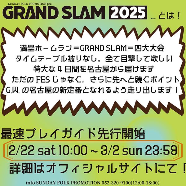すべて見る東海地区のイベンター“サンデーフォークプロモーション”が主催する『GRAND SLAM 2025』が、5月3日(土) から6日(火・祝) に初開催される。