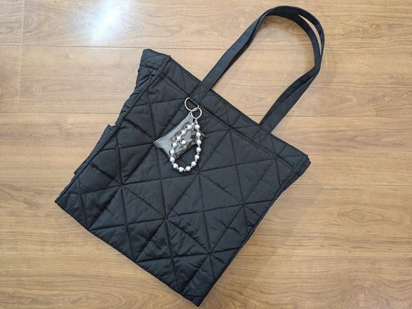 また、キルティングの模様が高級感を演出し、生地もしっかりしているため、安っぽさは感じません。持ち手の付け根部分にはDカンとシルバーのパール状チャーム、さらに透明のポーチが付属していて、エレガントなコーディネートにもマッチしそう♪